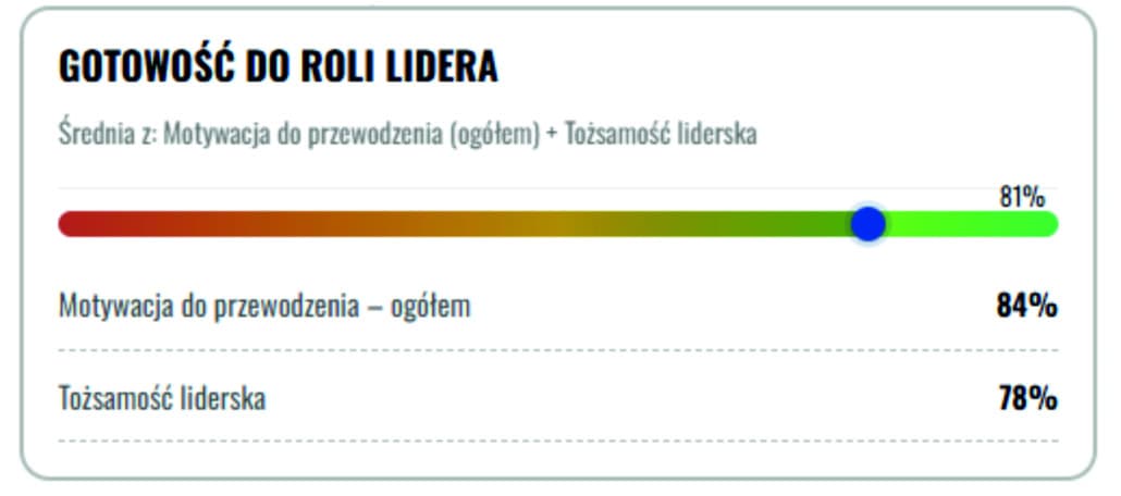 Motywacja do przewodzenia – ogółem: 84 procent – silny wewnętrzny napęd do obejmowania i pełnienia roli lidera. To sygnał, że energia do przewodzenia będzie dostępna na co dzień, nie tylko „od święta”.